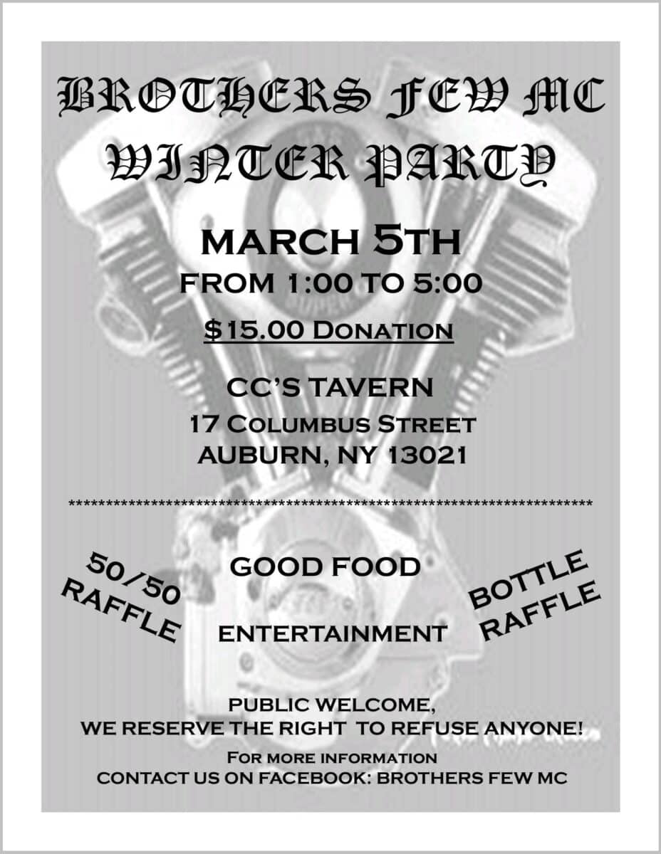 Brothers Few MC Winter Party This event has passed. Check back for the future dates. Saturday, March 5, 2022 at 1:00 pm - 5:00 pm Public – Open to anyone! Food, music and raffles! CC’s Tavern Auburn, NY 13021 United States + Google Map « View all events