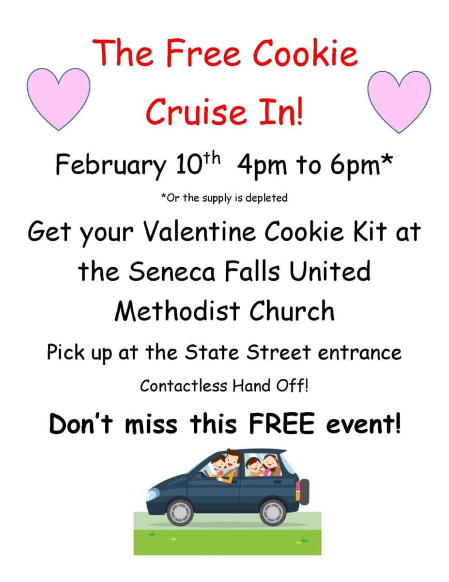 Get your FREE Valentine Cookie Kit at the Seneca Falls United Methodist Church, at the State Street entrance from 4pm to 6pm on the 10th. The cookie kits are Free and open to anyone who wants a kit.