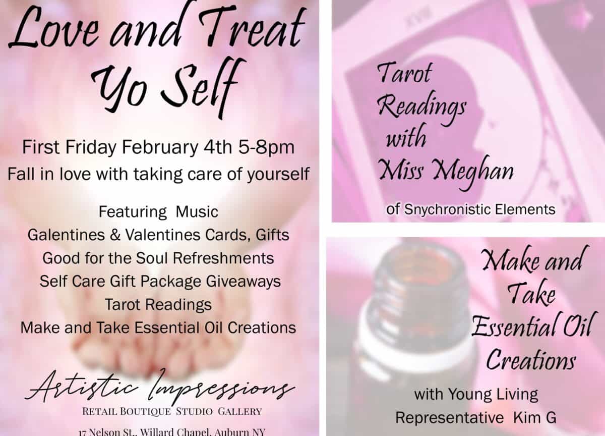 Love & Treat Yo Self This event has passed. Check back for the future dates. Friday, February 4, 2022 at 5:00 pm - 8:00 pm Your first love should be yourself… Celebrate at our First Friday Treat Yo Self Event Friday February 4th, 5-8pm Willard Memorial Chapel 17 Nelson Street Auburn, NY 13021 United States + Google Map « View all events