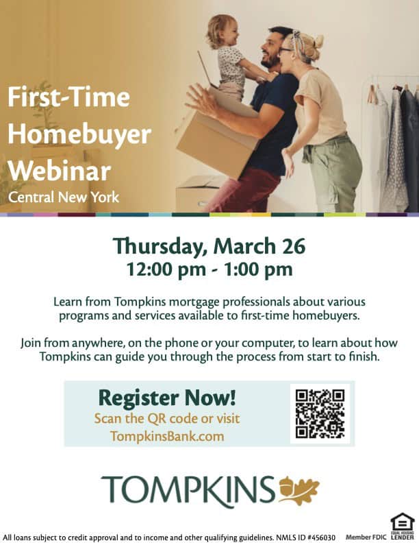 Learn from Tompkins mortgage professionals about various programs and services available to first-time homebuyers. Join from anywhere, on the phone or your computer, to learn about how Tompkins can guide you through the process from start to finish.