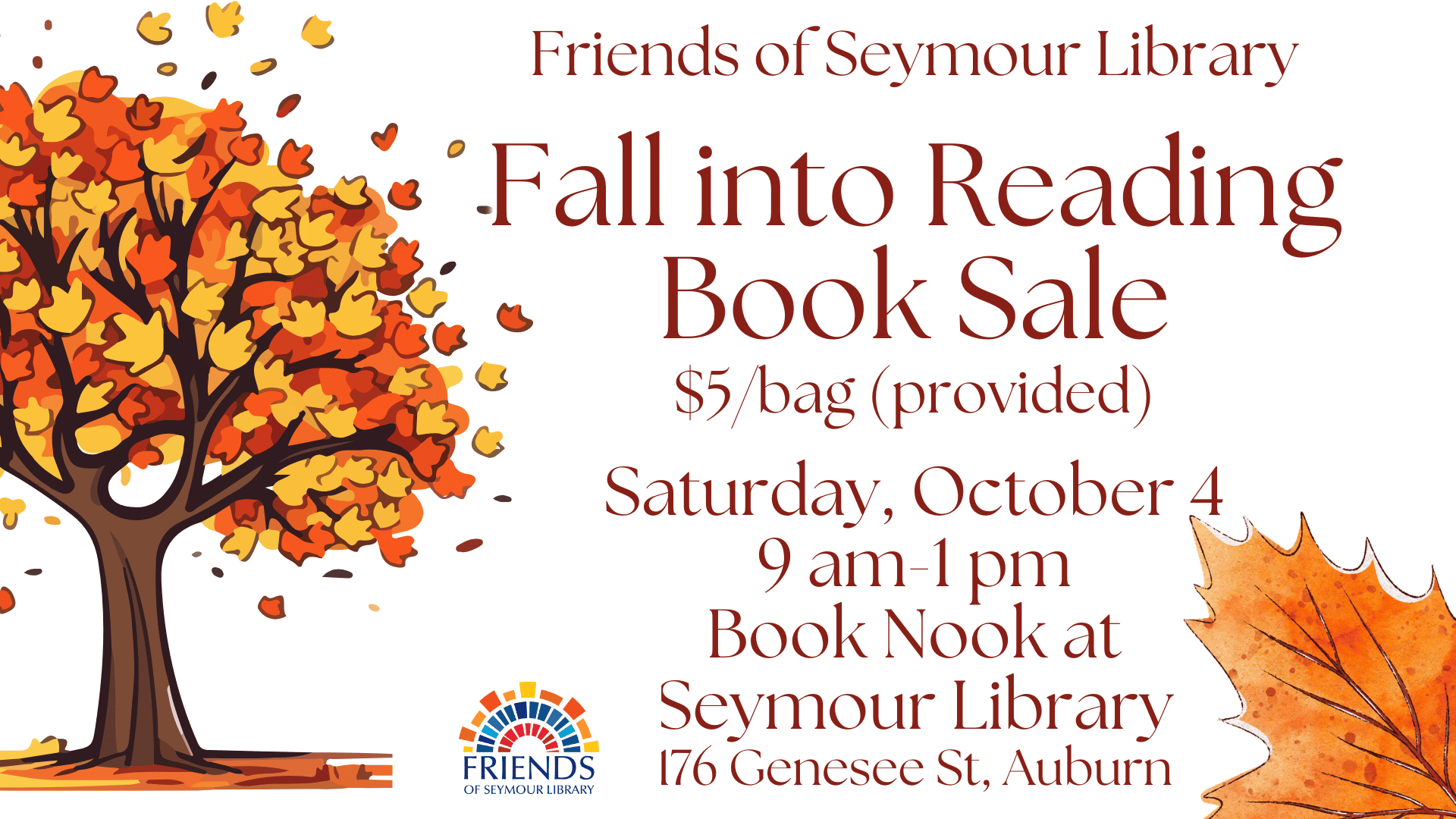 "Fall into Reading" in the Book Nook at Seymour Library, 176 Genesee Street, Auburn - the $5/bag Fall Book Sale is here! Bags will be provided. Fill a bag with as many books as you can carry for just a $5 donation.
