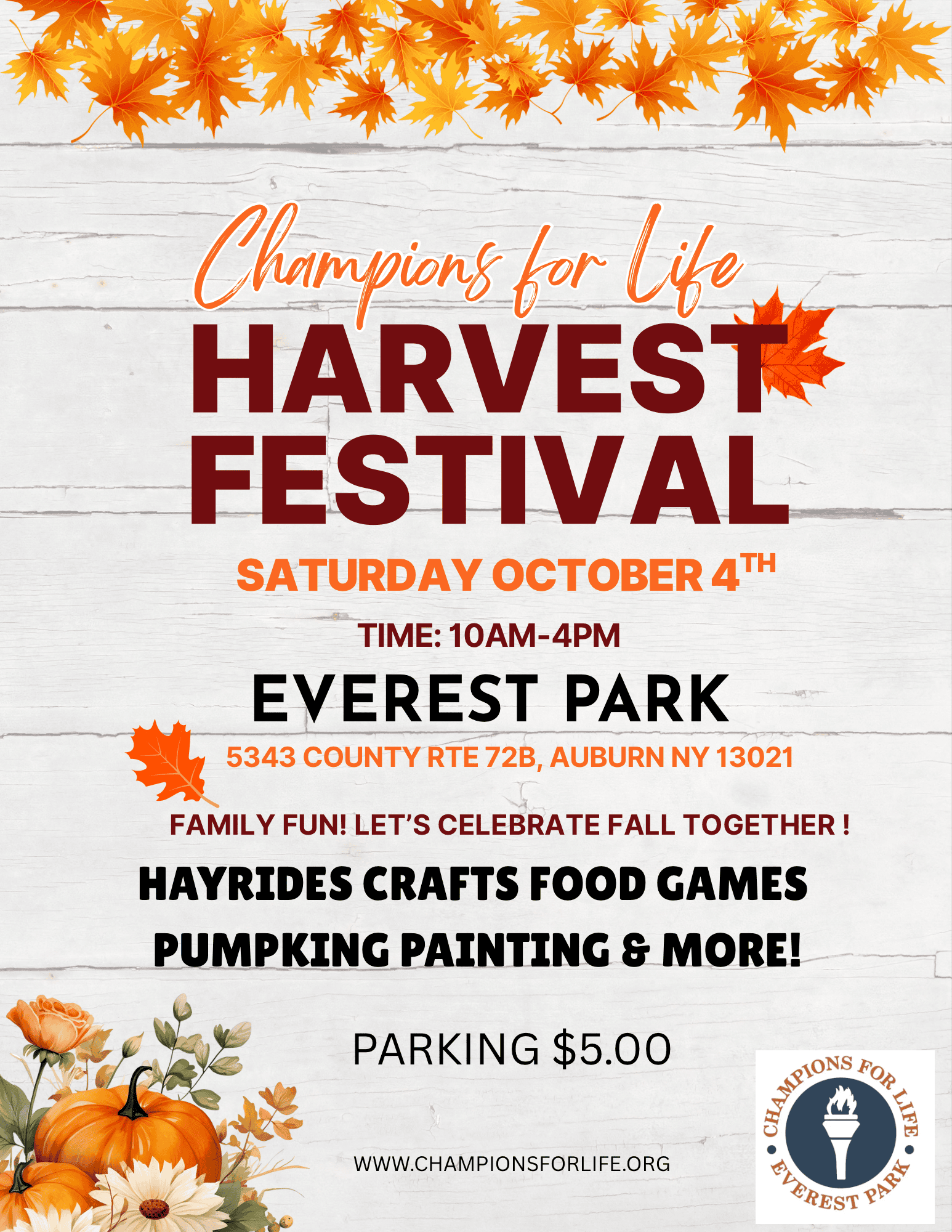Champions for Life will be welcoming Fall with our first annual Harvest Festival at Everest Park! Expect hayrides, facepainting, crafts for the kids, vendors offering an array of fun items for purchase, plenty of food and drink, pony rides, a petting zoo, and possibly even more! Help us celebrate the season at the incomparable Everest Park!