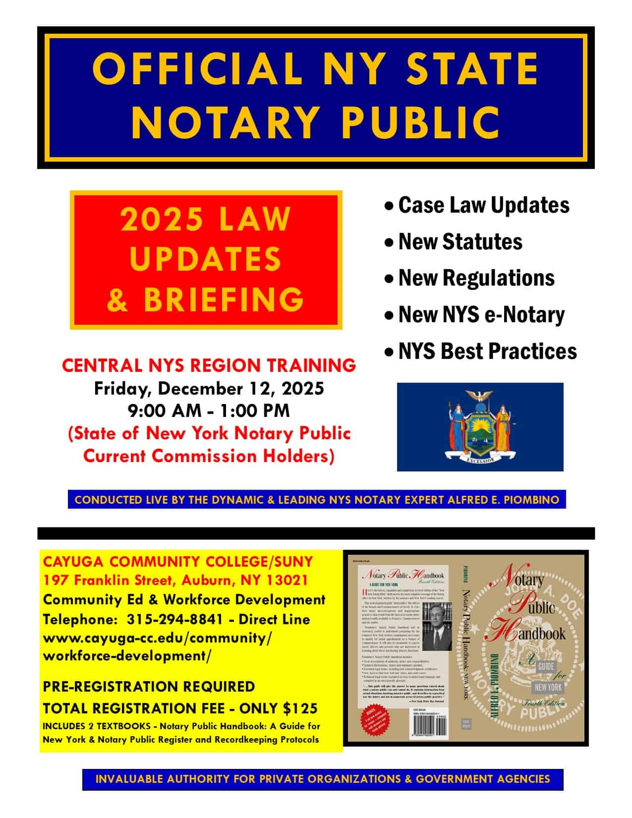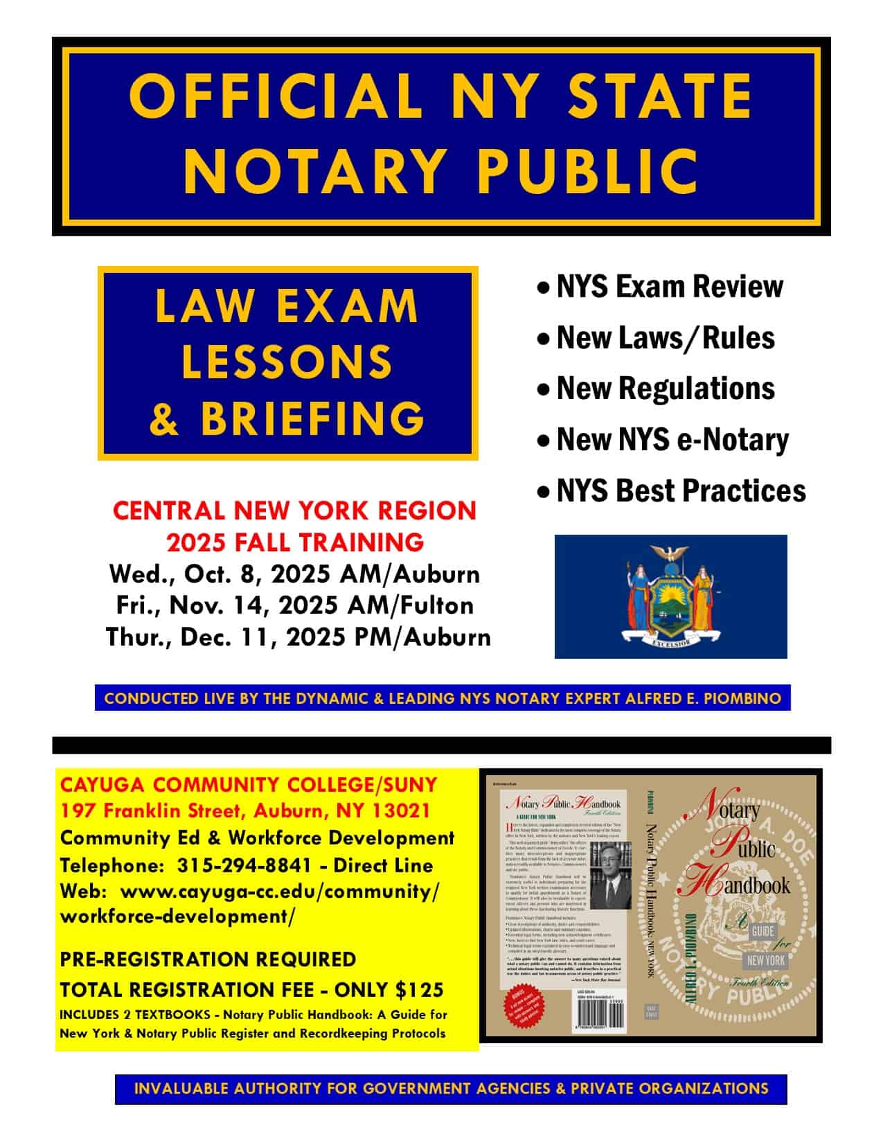 AUBURN, NY - Law Scholar Alfred E. Piombino will lead a rare, in-person New York State Notary Public Workshop on Thursday, December 11, 2025 from 5:30 until 9:30 p.m. at the Cayuga Community College/SUNY Main Campus, 197 Franklin Street in Auburn. Parking is free and no car permit is required. Public transit is available at the college. This event is intended for non-lawyers and is the only in-person training event of its kind in Cayuga […]